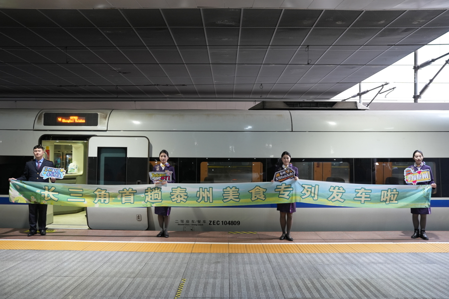 泰州美食专列由中国铁路上海局集团有限公司联合泰州市开发,推出特色服务举措,推动服务提档升级,助推泰州“冠军足球文化+地方特色美食”双IP融合,助力当地打造消费新场景、推动文旅经济发展,更好惠民生、扩内需、促消费。