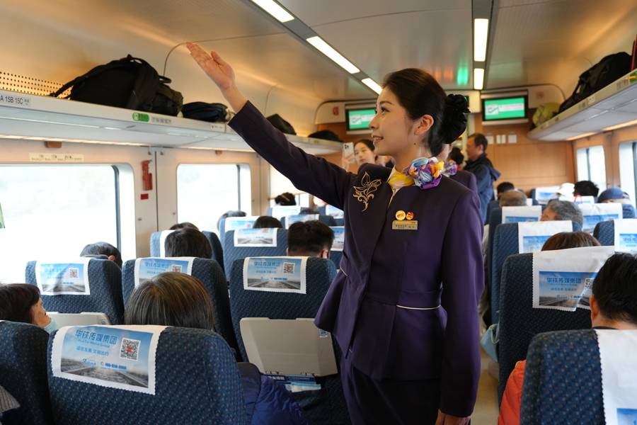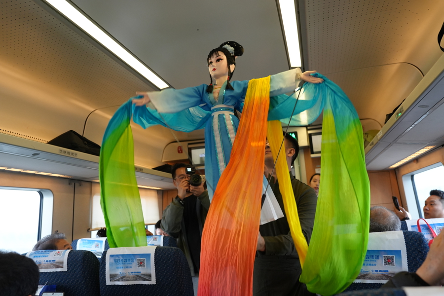 列车飞驰,泰州本地非遗节目在车厢内上演,在小提琴的悠扬乐声中,杖头木偶“翩翩起舞”,表演者双手运用自如、灵活准确地把握着手中的各种道具,博得阵阵喝彩。担当本趟列车值乘任务的南京客运段精心准备了歌舞、朗诵、礼仪展示等节目。