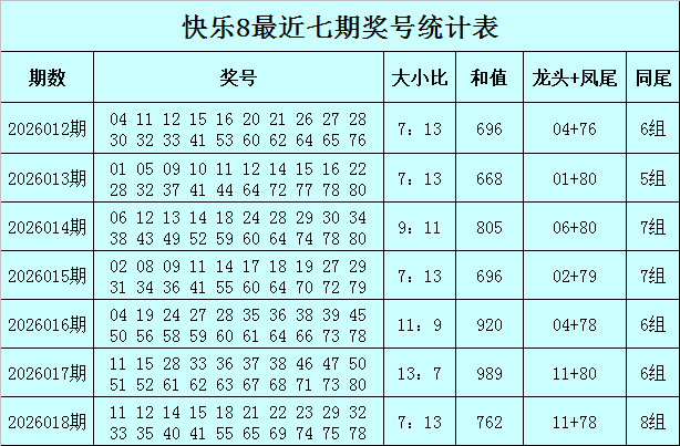 福彩快乐8第2026018期开奖回顾:11 12 14 15 18 21 22 23 29 32 33 35 40 41 55 65 69 74 75 78,其中奖号大小比开出7:13,和值为762,跨度为67,包含7组同尾号:11 21 41、12 22 32、23 33、14 74、15 35 55 65 75、18 78、29 69。